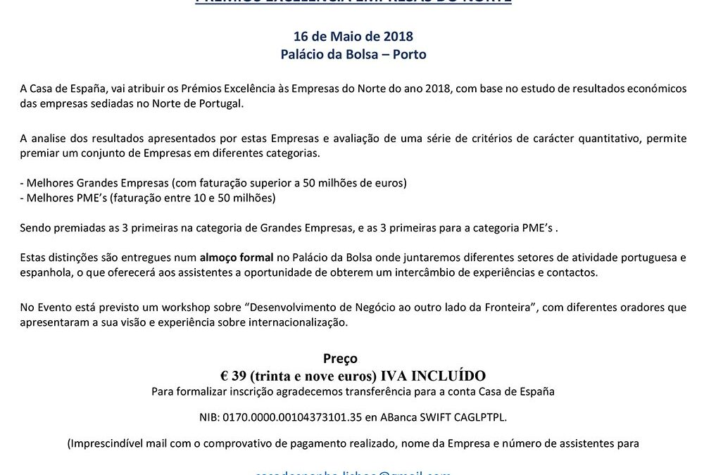 - Entrega de la XV Edición Prémios Excelencia Casa de España 2018 a las mejores empresas Portuguesas de Capital Español